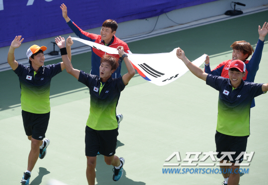 인천 아시안게임 정구 남자 단체전 한국과 일본의 결승전이 4일 인천 열우물테니스경기장에서 열렸다. 한국 김형준이 2매치 단식에서 4-2로 승리를 거두며 매치 스코어 2-0으로 단체전 우승을 차지한 선수들이 환호하고 있다.