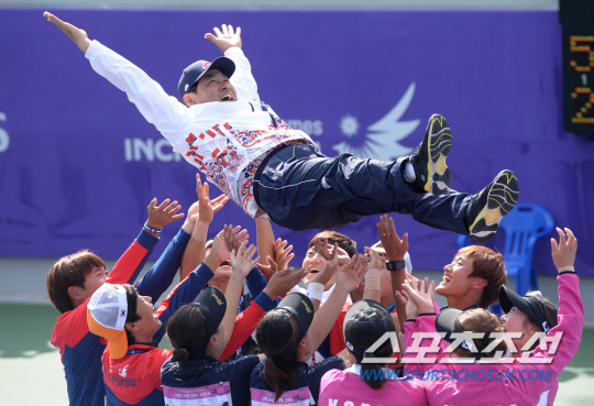 인천 아시안게임 정구 남녀 단체전 한국과 일본의 결승전이 4일 인천 열우물테니스경기장에서 동시에 열렸다. 남자에 이어 여자도 일본을 꺾고 금메달을 차지했다. 전종목 금메달을 딴 남녀 선수들이 감독을 헹가래치고 있다.