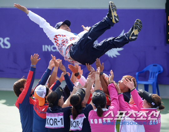 인천 아시안게임 정구 남녀 단체전 한국과 일본의 결승전이 4일 인천 열우물테니스경기장에서 동시에 열렸다. 남자에 이어 여자도 일본을 꺾고 금메달을 차지했다. 전종목 금메달을 딴 남녀 선수들이 감독을 헹가래치고 있다.