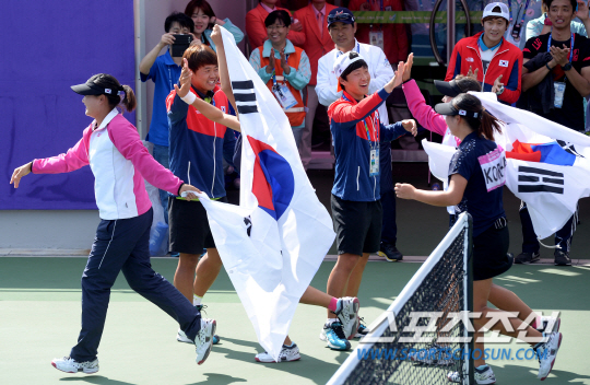 인천 아시안게임 정구 남녀 단체전 한국과 일본의 결승전이 4일 인천 열우물테니스경기장에서 동시에 열렸다. 남자에 이어 여자도 일본을 꺾고 금메달을 차지했다. 여자 선수들이 태극기를 들고 코트를 돌고 있는 가운데 먼저 금메달을 딴 남자 단체 선수들이 축하해주고 있다.