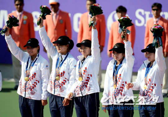 인천 아시안게임 정구 남녀 단체전 한국과 일본의 결승전이 4일 인천 열우물테니스경기장에서 동시에 열렸다. 남자에 이어 여자도 일본을 꺾고 금메달을 차지했다. 여자 선수들이 시상식에서 금메달을 목에 걸고 있다.