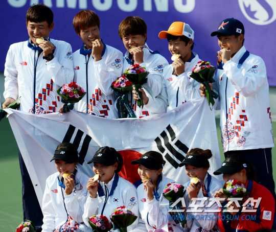 인천 아시안게임 정구 남녀 단체전 한국과 일본의 결승전이 4일 인천 열우물테니스경기장에서 동시에 열렸다. 남녀 모두가 일본을 꺾고 우승을 차지한 가운데 금메달을 목에 건 남녀 선수들이 함께 기념촬영을 하고 있다.