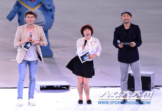 4일 오후 인천아시아드 주경기장에서 2014 인천 아시안게임의 폐막식이 열렸다. '평화의 물결, 아시아의 미래'라는 슬로건을 내걸고 16일간의 열전을 거듭한 '제17회 인천 아시안게임'이 인천아시아드주경기장에서 열리는 폐회식을 끝으로 대단원의 막을 내렸다. 한국은 수영과 육상, 야구와 축구 등 36개 종목에서 열전을 벌인 가운데 총 금메달 79개을 획득해 5회 연속 종합 2위를 수성하며 목표를 달성했다. 폐막식에서 개그민 변승윤(왼쪽부터), 김영희, 정찬민이 관람객 레크리에이션을 진행하 있다.