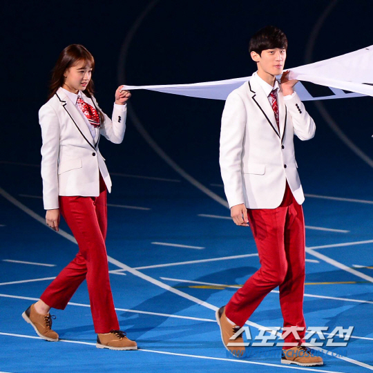 4일 오후 인천아시아드 주경기장에서 2014 인천 아시안게임의 폐막식이 열렸다. '평화의 물결, 아시아의 미래'라는 슬로건을 내걸고 16일간의 열전을 거듭한 '제17회 인천 아시안게임'이 인천아시아드주경기장에서 열리는 폐회식을 끝으로 대단원의 막을 내렸다. 한국은 수영과 육상, 야구와 축구 등 36개 종목에서 열전을 벌인 가운데 총 금메달 79개을 획득해 5회 연속 종합 2위를 수성하며 목표를 달성했다. 폐막식에서 기수단의 손연재가 입장하고 있다.