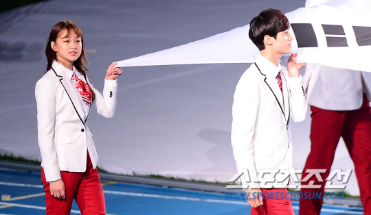 4일 오후 인천아시아드 주경기장에서 2014 인천 아시안게임의 폐막식이 열렸다. '평화의 물결, 아시아의 미래'라는 슬로건을 내걸고 16일간의 열전을 거듭한 '제17회 인천 아시안게임'이 인천아시아드주경기장에서 열리는 폐회식을 끝으로 대단원의 막을 내렸다. 한국은 수영과 육상, 야구와 축구 등 36개 종목에서 열전을 벌인 가운데 총 금메달 79개을 획득해 5회 연속 종합 2위를 수성하며 목표를 달성했다. 폐막식에서 손연재가 기수단으로 입장하고 있다.