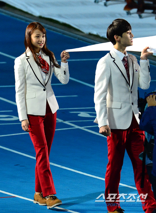 한국 선수단의 기수는 리듬체조 손연재, 볼링 이나영, 양궁 이특영, 사격 김민지, 축구 임창우, 태권도 이대훈, 육상 여호수아, 사이클 조호성이 선정됐다.