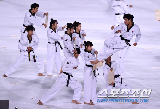 4일 오후 인천아시아드 주경기장에서 2014 인천 아시안게임의 폐막식이 열렸다. '평화의 물결, 아시아의 미래'라는 슬로건을 내걸고 16일간의 열전을 거듭한 '제17회 인천 아시안게임'이 인천아시아드주경기장에서 열리는 폐회식을 끝으로 대단원의 막을 내렸다. 한국은 수영과 육상, 야구와 축구 등 36개 종목에서 열전을 벌인 가운데 총 금메달 79개을 획득해 5회 연속 종합 2위를 수성하며 목표를 달성했다. 폐막식에서 국기원 태권도단의 시범이 열리고 있다.