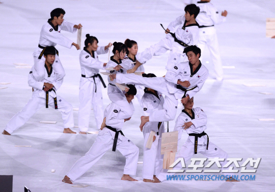 4일 오후 인천아시아드 주경기장에서 2014 인천 아시안게임의 폐막식이 열렸다. '평화의 물결, 아시아의 미래'라는 슬로건을 내걸고 16일간의 열전을 거듭한 '제17회 인천 아시안게임'이 인천아시아드주경기장에서 열리는 폐회식을 끝으로 대단원의 막을 내렸다. 한국은 수영과 육상, 야구와 축구 등 36개 종목에서 열전을 벌인 가운데 총 금메달 79개을 획득해 5회 연속 종합 2위를 수성하며 목표를 달성했다. 폐막식에서 국기원 태권도단의 시범이 열리고 있다.