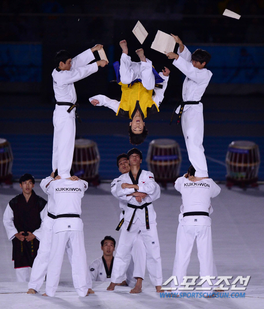 4일 오후 인천아시아드 주경기장에서 2014 인천 아시안게임의 폐막식이 열렸다. '평화의 물결, 아시아의 미래'라는 슬로건을 내걸고 16일간의 열전을 거듭한 '제17회 인천 아시안게임'이 인천아시아드주경기장에서 열리는 폐회식을 끝으로 대단원의 막을 내렸다. 한국은 수영과 육상, 야구와 축구 등 36개 종목에서 열전을 벌인 가운데 총 금메달 79개을 획득해 5회 연속 종합 2위를 수성하며 목표를 달성했다. 폐막식에서 국기원 태권도단의 시범이 열리고 있다.
