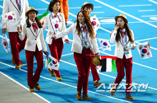 인천 아시안게임이 16일 간의 대장정을 마무리하는 폐막식이 4일 오후 인천아시아드주경기장에서 열렸다. 리듬체조 단체전에서 손연재와 함께 은메달을 딴 이나경, 김윤희, 이다애가 입장하고 있다.