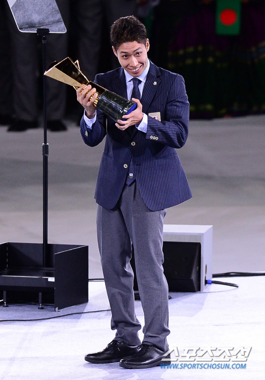 4일 오후 인천아시아드 주경기장에서 2014 인천 아시안게임의 폐막식이 열렸다. '평화의 물결, 아시아의 미래'라는 슬로건을 내걸고 16일간의 열전을 거듭한 '제17회 인천 아시안게임'이 인천아시아드주경기장에서 열리는 폐회식을 끝으로 대단원의 막을 내렸다. 한국은 수영과 육상, 야구와 축구 등 36개 종목에서 열전을 벌인 가운데 총 금메달 79개을 획득해 5회 연속 종합 2위를 수성하며 목표를 달성했다. 폐막식에서 대회 MVP로 선정된 수영 4관왕 일본 하기노가 트로피를 받아들고 있다.