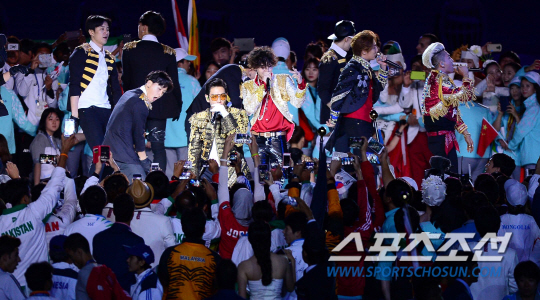 4일 오후 인천아시아드 주경기장에서 2014 인천 아시안게임의 폐막식이 열렸다. '평화의 물결, 아시아의 미래'라는 슬로건을 내걸고 16일간의 열전을 거듭한 '제17회 인천 아시안게임'이 인천아시아드주경기장에서 열리는 폐회식을 끝으로 대단원의 막을 내렸다. 한국은 수영과 육상, 야구와 축구 등 36개 종목에서 열전을 벌인 가운데 총 금메달 79개을 획득해 5회 연속 종합 2위를 수성하며 목표를 달성했다. 폐막식에서 빅뱅의 축하공연이 열리고 있다.