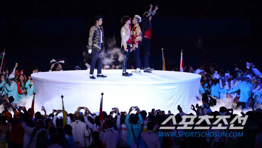 4일 오후 인천아시아드 주경기장에서 2014 인천 아시안게임의 폐막식이 열렸다. '평화의 물결, 아시아의 미래'라는 슬로건을 내걸고 16일간의 열전을 거듭한 '제17회 인천 아시안게임'이 인천아시아드주경기장에서 열리는 폐회식을 끝으로 대단원의 막을 내렸다. 한국은 수영과 육상, 야구와 축구 등 36개 종목에서 열전을 벌인 가운데 총 금메달 79개을 획득해 5회 연속 종합 2위를 수성하며 목표를 달성했다. 폐막식에서 빅뱅의 축하공연이 열리고 있다.