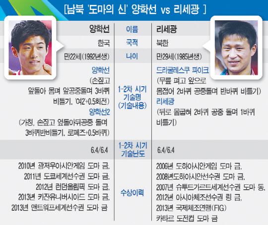 인천 금메달리스트 섹와이홍은 평균 14.999점에 그쳤다. 양학선이 도마 앞에 섰다. 경쟁자들보다 먼저 뛰는 만큼 기선제압이 중요했다. 자신의 이름을 건 신기술 '양학선2'를 야심차게 시도했다. '공중에서 1260도 비틀기'는 성공했지만, 착지에서 밀리며 뒤로 넘어졌다. 2차시기는 또다시 승부수를 던졌다. 자신의 첫번째 신기술 '양학선1'에 도전했다. 공중에서 3바퀴 비틀기는 성공했지만, 충분한 체공시간이 확보되지 않았다. 또다시 착지에서 실수를 범했다. 평균 14.416점, 아쉬운 점수였다. 인천에서 고배를 마셨던 북한 '도마의 신' 리세광이 15.416점으로 금메달을 목에 걸었다. 라디빌로프가 15.333점으로 은메달, 미국의 달턴이 15.199점으로 동메달을 따냈다. 런던올림픽 은메달리스트이자 이번대회 마루 금메달리스트인 아블랴진 역시 착지 실수를 범하며 14.116점, 최하위에 랭크됐다.