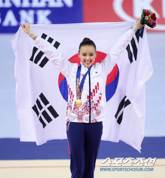 손연재가 마침내 첫 금메달을 목에 걸었다. 인천 아시안게임 리듬체조 개인종합 결승전이 2일 인천 남동체육관에서 열렸다. 금메달을 목에 건 손연재가 시상식에서 대형 태극기를 펼쳐들고 포즈를 취하고 있다. 인천=정재근 기자 cjg@sportschosun.com