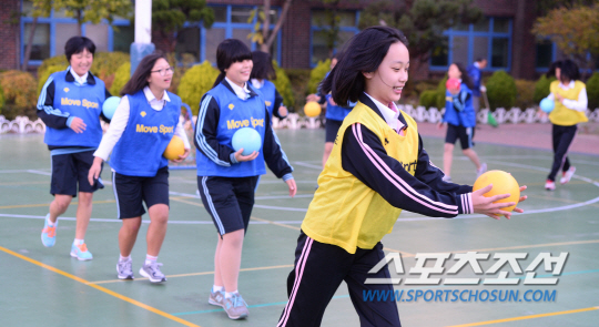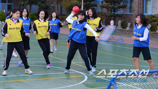 지난 17일 오전 7시30분, 서울 동숭동에 위치한 서울사대부설여중 운동장에선 소녀들의 청량한 웃음소리가 울려퍼졌다. 낙엽만 굴러도 꺄르르 웃는 나이, 아침운동을 위해 모인 소녀들의 표정은 생기발랄했다. 서울시교육청이 주최하고 데상트스포츠재단과 학교체육 전문 솔루션 회사 위피크가 주관하는 아침운동 활성화 프로그램 '무브 스포츠(Move Sport)' 수업을 신청한 여학생들이다. 농구 코트 위에 사방 1m , 네모반듯 낯선 골 네트가 눈에 띄었다. 핸드볼을 변형해 만든 '추크볼'이다. 네트를 향해 힘차게 공을 던진다. 튕겨나온 볼을 상대가 잡지 못할 경우 득점으로 인정된다. 네트를 맞추더라도 상대가 리바운드 볼을 잡을 경우엔 득점이 인정되지 않는다. 노랑, 파랑조끼를 나눠 입은 각 10명의 소녀들이 휘슬과 함께 일제히 골네트를 향해 달리기 시작했다.