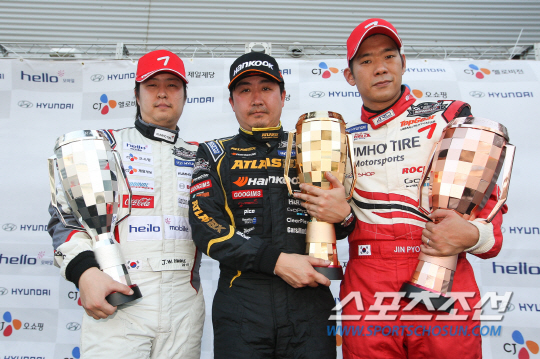 ◇2일 전남 영암 코리아인터내셔널서킷에서 열린 'CJ헬로모바일 슈퍼레이스 챔피언십' 슈퍼 6000 클래스 결선에서 우승을 차지한 조항우(가운데)와 2위 황진우(왼쪽), 3위 김진표가 트로피를 들고 포디움에 나란히 섰다. 사진제공=슈퍼레이스