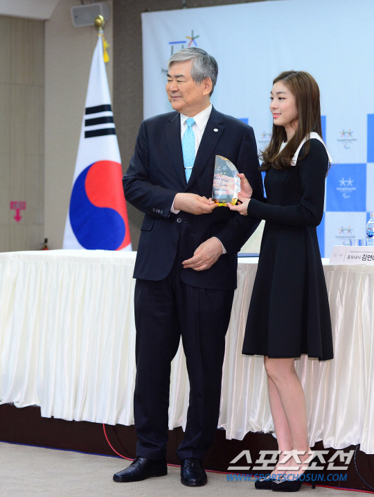4일 오전 서울 프레스센터에서 김연아의 2018 평창동계올림픽대회 및 장애인 동계올림픽 홍보대사 위촉 기자회견이 열렸다. 김연아는 앞으로 동계올림픽 홍보를 위해 진행되는 국내외 주요 행사 및 온라인 홍보, 광고 등의 사업에 참여하여 범국민적 붐 조성에 크게 기여할 것으로 기대된다. 김연아는 2009년 평창 동계올림픽 유치 때도 홍보대사로 활약했고 2011년 남아공 더반에서 동계올림픽 개최지 선정 프리젠테이션에 참가하였으며 현재 조직위원회 집행위원으로 평창과 각별한 인연을 이어가고 있다. 위촉 기자회견에서 김연아가 조양호 조직위원장과 포즈를 취하고 있다. 김경민 기자 kyungmin@sportschosun.com / 2014.11.04.