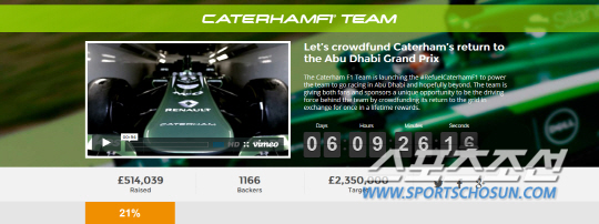 이런 가운데 캐터햄은 미국과 브라질 그랑프리를 건너뛴 후 오는 21일(이하 한국시각) 열리는 시즌 최종전인 아부다비 그랑프리에 참가하기 위해 '크라우드펀딩'을 시작했다. 최소 목표액이 235만파운드(약 40억6700만원)인데, 모금 마감 일주일도 남지 않은 8일 현재 21%인 51만파운드 모집에 그치고 있다. 팬들이 스폰서를 한다는 것인데, 말 그대로 눈물겨운 노력이 아닐 수 없다.