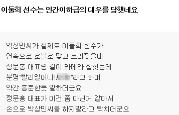 10일 한 온라인 커뮤니티에는 '이둘희 선수 인간이하의 대우를 당했다'는 제목의 글이 게재됐다.
