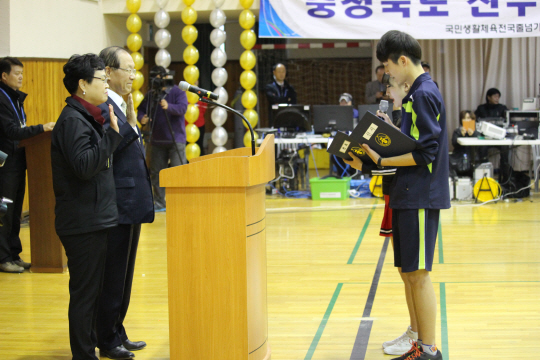 8일 인천동부학생체육관에서 전국학교스포츠클럽 줄넘기 대회가 열렸다. 황우여 교육부 장관과 김정순 국민생활체육전국줄넘기연합회장이 선수들의 선서를 받고 있다. 사진제공=국민생활체육전국줄넘기연합회