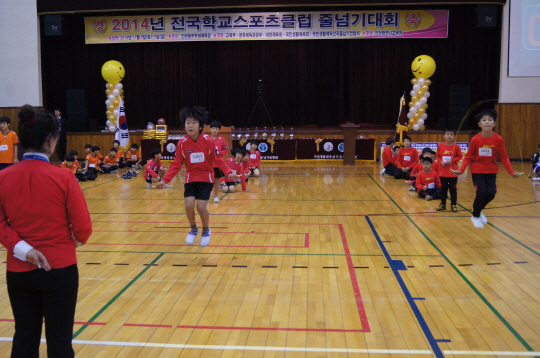 8일과 9일 인천동부학생체육관에서 열린 2014년 전국학교스포츠클럽 줄넘기 대회 현장에서 자주 볼 수 있는 풍경이었다. 이번 대회는 첫 출전지인 세종시를 포함하여 17개 시도 1700여명의 초중고등학교 학생들이 참가했다. 전국학교스포츠클럽 줄넘기대회는 엘리트 선수들이 아닌 일반학생들이 참여한다. 각 학교예선부터 시작해 지역교육청대회, 시도대회에서 우승한 팀들이 모인다. 전국 줄넘기 챔피언 결정전인 셈이다. '줄 하나로 온 국민이 건강해지는 그날까지'라는 슬로건 아래 교육부, 문화체육관광부 그리고 국민생활체육회와 대한체육회가 공동주최하고 국민생활체육 전국줄넘기연합회가 주관했다. 8일 열린 개회식에는 특히 황우여 교육부 장관이 참석해 학생들을 격려했다. "학생시절부터 검도를 연마해 체력을 단련했다"고 한 황 장관은 "우리 학생들이 체육활동을 통해 몸과 마음을 단련해 행복한 인생을 살아나가는 밑거름이 만들었으면 좋겠다"고 했다.