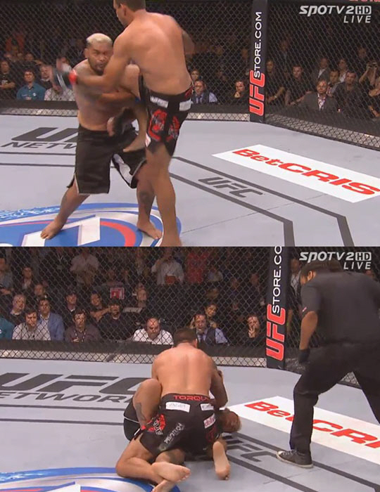 미국 종합격투기 UFC 헤비급 강자 마크 헌트가 플라잉 파브리시오 베두움 니킥 한 방에 TKO 패배를 당했다.