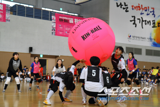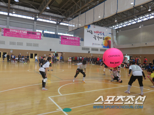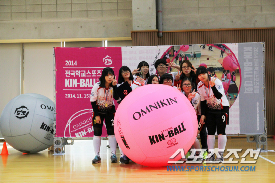15~16일 양일간 경기도 이천 장애인체육종합훈련원에서 2014년 전국학교스포츠클럽 킨볼 대회가 펼쳐졌다. 참가열기는 뜨거웠다. 수도권, 대전, 부산, 제주까지 전국 각지에서 초등부 11개팀, 남중부 7개팀, 여중부 6개팀, 남고부 8개팀, 여고부 5개팀이 출전했다. 지름 1.22m 대형볼을 사이에 두고 전국의 초중고 학생들이 함께 손을 모았다. 거침없이 몸을 던졌다.