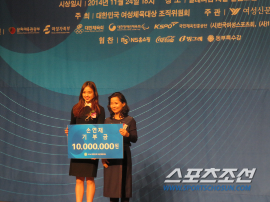 손연재는 올시즌 포르투갈 리스본월드컵 금메달을 비롯해 월드컵 11대회 연속 메달을 획득한 데 이어 터키 이즈마르세계선수권에서 개인종합 4위에 올랐고, 인천아시안게임에서 리듬체조 사상 최초의 금메달을 목에 걸었다. 김운용 회장에게 직접 상패를 받은 손연재는 벅찬 소회를 표했다. "저에게 큰 상을 주셔서 감사하다. 2014년은 제게 뜻깊은 한해였다. 인천아시안게임, 어렸을 때부터 꿈꿔온 무대에서 금메달을 목에 걸게 돼 행복한 한해였다. 이렇게 뜻깊은 상까지 받게 돼 잊지못할 한해로 기억될 것같다. 좋은 상을 주신 만큼 더 열심히 하라는 의미로 받아들이고 계속 선수생활 끝날 때까지 최선을 다해 발전하는 모습을 보여드리도록 하겠다"고 말했다. 상패와 함께 주어진 상금 1000만원을 '사단법인 어르신이 행복한 은빛 세상'에 전액 기부해 독거노인 돕기에 쓰기로 했다. 시상식 현장에서 기부금 전달식을 가졌다.