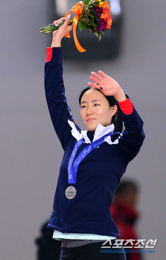 2014-2015 국제빙상경기연맹(ISU)스피드 스케이팅 월드컵 2차대회가 11월21일 오전 서울 공릉동 태릉국제스케이트장에서 열렸다. 여자 500m 디비전 A 경기 시상식에서 은메달을 차지한 한국 이상화가 손을 흔들고 있다. 김경민 기자 kyungmin@sportschosun.com/2014.11.21.