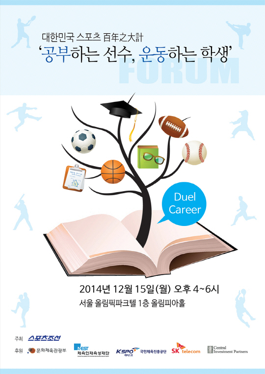 스포츠조선이 주최하는 '대한민국 스포츠 백년지대계-공부하는 선수, 운동하는 학생' 포럼(후원: 문화체육관광부, 체육인재육성재단, 국민체육진흥공단, SK텔레콤, 센트럴투자파트너스)이 15일 오후 4~6시 서울 방이동 올림픽 파크텔 1층 올림피아홀에서 열린다.