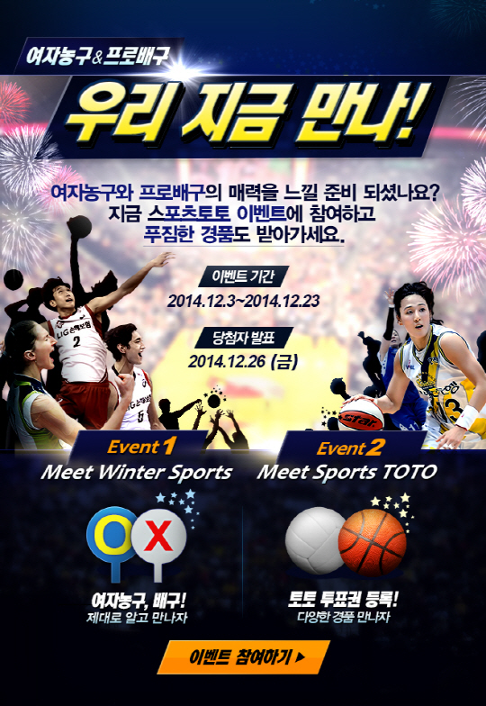 국민체육진흥공단(www.kspo.or.kr)이 발행하는 국민체육진흥투표권 수탁사업자인 스포츠토토(www.sportstoto.co.kr)가 여자농구와 프로배구 등 겨울스포츠 활성화를 위해 '여자농구&프로배구, 우리 지금 만나!' 이벤트를 실시한다고 밝혔다.