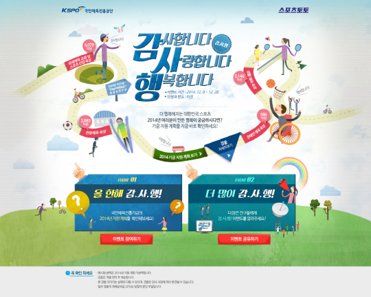 두 가지 방식으로 진행되는 이번 이벤트에서 첫 번째 '올 한해 감.사.행!' 이벤트의 경우, 생활체육육성, 전문 체육 육성, 장애인 체육 육성, 국제체육 교류 및 스포츠 산업 육성 등 다양한 방면으로 지원이 계획된 국민체육진흥기금의 쓰임새를 살펴보기만 하면 추첨을 통해 순토 아웃도어 시계 1명, 오클리 선글라스 5명, 몰스킨 2015 플래너 50명, 커피빈 바닐라라떼 S 기프티콘 200명 등 푸짐한 상품을 증정한다. 하루에 한번만 참여할 수 있으며, 많이 참여할수록 당첨 가능성이 높아진다.