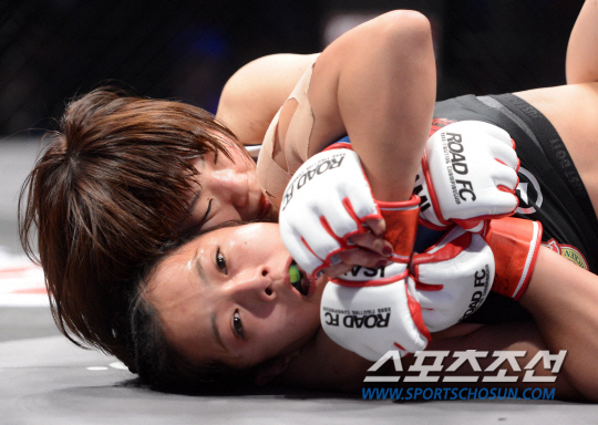 송가연 사토미 14일 서울 올림픽공원 올림픽홀에서 열린 로드FC 020 대회 송가연과 일본의 타카노 사토미의 대결에서 송가연이 라운드 4분 29초 기무라록 패를 당했다. 타카노 사토미의 공격에 괴로워하는 송가연의 모습. 사진=허상욱 기자 wook@sportschosun.com