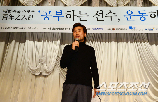 스포츠조선이 주최하는 '대한민국 스포츠 백년지대계-공부하는 선수, 운동하는 학생' 포럼(후원: 문화체육관광부, 체육인재육성재단, 국민체육진흥공단, SK텔레콤, 센트럴투자파트너스)에서 토론 패널로 참가한 이규혁이 '공부란 무엇인가'를 이야기하고 있다. 정재근 기자 cjg@sportschosun.com/2014.12.15/