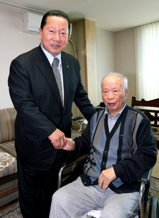 김 회장은 26일 오후 2시 '2013년 대한체육회 선정 스포츠 영웅'이자 1947년 제51회 보스턴국제마라톤 우승자인 서 고문의 강동구 길동 자택을 찾았다.