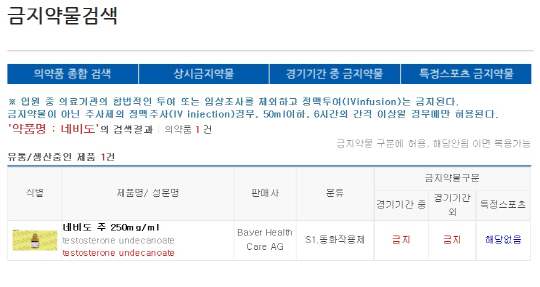 한국도핑방지위원회 홈페이지 '금지약물' 검색란에 '네비도'라는 세글자를 치면, 곧바로 '금지약물'이라는 빨간색 글자가 뜬다. 국제반도핑기구(WADA)가 지정한 금지약물 리스트에서 'S1.동화작용제' 분류로 경기기간은 물론 경기기간 외에도 금지되며, 모든 스포츠 종목에 금지되는 약물이다. '테스토스테론 언테카노에이트'라는 부제에는 이미 '남성호르몬 테스토스테론'이라는 명칭이 함께 들어있다. 제품명을 누르면, 바이엘 헬스케어에서 제조하는 '네비도'는 명백히 남성호르몬제로 분류돼 있으며, 약품의 효능은 '남성 일차성, 이차성 성선기증저하증에 테스토르테론 대체치료'로 명시돼 있다.