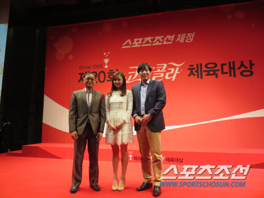 곧바로 이어진 20주년 기념 황금 트로피 전달식에서 '코카콜라 역대 MVP 클럽' 선배들은 '막내' 손연재를 환영했다. 손연재는 '삼촌뻘' 김영호, 이봉주를 비롯 유승민, 장미란 등 선배들과 정겹게 기념사진을 찍으며 코카콜라 20회의 역사를 되새겼다. 리듬체조 꿈나무인 '6회 MVP' 이주형 공주대 교수(체조)의 딸 세인양(11)은 '연재언니'에게 쪼르르 달려갔다. 꿈꾸던 사인을 손에 넣은 후 득의양양, 함박웃음을 지었다.