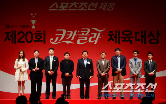 스포츠조선 제정 제20회 코카콜라 체육대상 시상식이 24일 오전 서울 소공로 웨스틴조선호텔 그랜드볼룸에서 열렸다. 1995년 제정된 아마추어 최고, 최대의 시상식인 코카콜라 체육대상은 올해로 20회를 맞는다. 20주년 레전드 트로피를 수상한 수상자들이 함께 포즈를 취하고 있다. 송정헌 기자 songs@sportschosun.com/2015.02.24