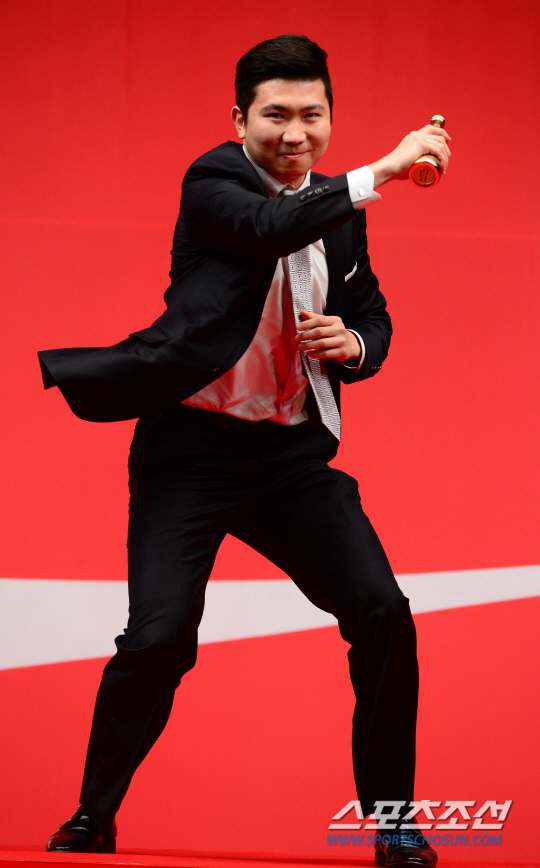 20주년 레전드 트로피를 수상한 체조 이주형 공주대 교수가 수상 세리머니를 펼치고 있다. 송정헌 기자 songs@sportschosun.com/2015.02.24