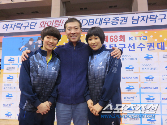 ◇대한민국 탁구 레전드 김택수 대우증권 감독(가운데)이 지난해 말 제68회 남녀종합탁구선수권 여자단체전에서 우승한 후 주전으로 맹활약한 10대 에이스 이시온(왼쪽), 이슬과 함께 활짝 웃고 있다. 전영지 기자