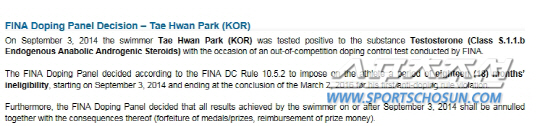 청문회가 끝난 직후 마르쿠레스쿠 사무총장이 이 회장과 정 전무를 불렀다. FINA로서도 박태환 케이스는 중대사안이었다. 점심도 굶은 채 호텔 레스토랑에서 꼬박 4시간동안 결과를 예의주시했다. 연맹은 사무총장으로부터 직접 '18개월 징계' 사실을 전해들었다. 24일 새벽 2시 박태환의 18개월 징계 사실이 FINA 홈페이지에 공지됐다. 반도핑법에 따르면 청문회의 결정내용은 청문회 후 20일 이내에 대중에게 공개하게 되어 있다. 2~3일 이내에 공개된 예는 많았지만, 청문회가 끝난지 불과 4시간만에 이뤄진 신속한 발표는 분명 이례적이었다. 대한수영연맹측은 "청문회 후 사무총장으로부터 구두로 18개월 징계 사실을 전해들었다. 결과를 기다리는 이들이 많으니, 확정된 내용이라면 시간 끌 것 없이 최대한 빨리 공지해달라고 부탁했다"고 했다. 해당 사실은 곧바로 박태환 측에도 통보됐다.