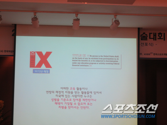 체육 양성평등 선포식에 이어 '체육 양성평등법 제정 방안'이라는 주제를 놓고 전문가들의 발표가 이어졌다. 조미혜 인하대 교수가 '양성평등 체육법안 제정의 의미', 장재옥 중앙대 교수가 '양성평등 체육법안의 입법 방향', 김원정 공주대 교수가 '외국의 양성평등 관련법 적용 사례', 김양례 한국스포츠개발원 책임연구원이 '양성평등 체육법안 제정의 현주소와 실행방안'을 주제로 발표했다. 남녀 학교체육의 기회 균등, 체육 양성평등법 제정 방안을 심도있게 논의했다. 1972년 제정된 미국 교육평등법 '타이틀9'의 예를 참조했다. '정부의 재정 지원을 받는 교육 프로그램이나 활동에서 미국에 있는 사람이면 누구나, 성별로 인해 참여를 제한받거나, 혜택이 거절되거나, 차별받아서는 안된다'는 내용이다. 모든 학교 교육에서 남녀가 '기회 균등'은 물론, 동일한 예산 및 시설 지원을 받게 되면서 스포츠에 참여하는 미국 여고생 인구는 무려 1100% 증가했다. 이날 주제발표에서는 '타이틀9'에 대한 고찰과 함께 체육 양성평등 법안 제정 방법론이 주로 논의됐다. '학교체육진흥법' 내에서 여학생 체육활동을 강조해 개정하는 방법과, 체육 양성평등법을 새로이 제정하는 방법 등이 제시됐다.