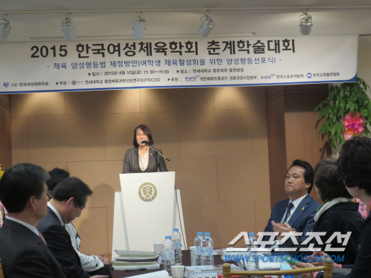 | 박영옥 한국스포츠개발원장이 10일 한국여성체육학회 춘계학술대회에서 축사를 하고 있다. |