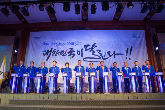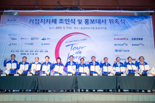 국민체육진흥공단(이사장 이창섭·이하 KSPO)이 7일 오전 11시 서울 방이동 올림픽파크텔 올림피아홀에서 '2015년 투르드코리아 거점 지자체 조인식 및 홍보대사 위촉식'을 가졌다. 이 자리에서 KSPO는 배우 서지석과 아나운서 정인영, 윤태진, 걸그룹 피에스타를 홍보대사로 선정해 위촉장을 수여했다. 또 엘리트대회 개최지인 부산, 구미, 무주, 여수, 강진, 군산, 대전 등 7개 지자체와 오는 10월 동호인 스페셜대회가 개최될 아산, 청양, 서천, 홍성 등 충남 지역 4개 지자체와 거점 지자체 조인식을 가졌다. 이 날 조인식에 참석한 공단 이창섭 이사장과 거점 지자체장들은 건강한 자전거 문화 확산을 위해 다양한 노력을 함께해 나가기로 뜻을 모았다.