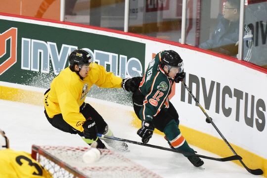 동양 이글스가 10일 서울 제니스 아이스링크에서 열린 인빅투스 후원 2015 제니스 한국독립아이스하키리그 정규리그 1라운드 3경기에서 인빅투스 웨이브즈와 슛 아웃 접전 끝에 가까스로 승리했다.