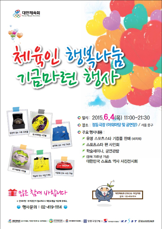 생활고를 겪고 있는 체육인을 돕기 위한 기금을 조성하고, 이에 대한 국민적 관심을 제고하기 위한 이 행사는 스포츠스타 기증품 판매 및 팬 사인회, '광복 70주년' 스포츠 역사 사진전시회, 학술세미나 등 다채로운 프로그램으로 구성됐다. 한국체육학회, 한국체육기자연맹, 정동극장, 한국올림픽성화회, 한국스포츠과학기술포럼이 공동주최한다.
