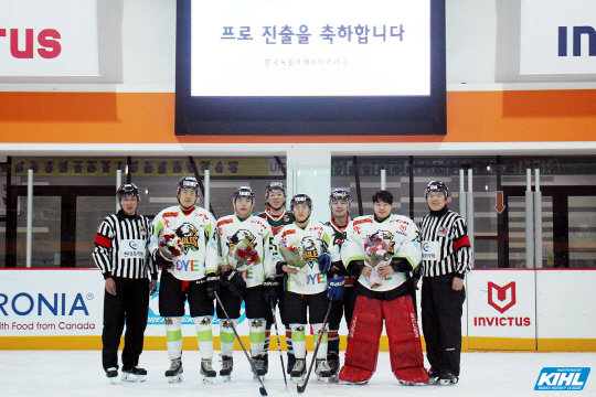 지난달 30일 서울 제니스 아이스링크에서 열린 인빅투스 후원 2015 제니스 한국독립아이스하키리그 (이하 제니스 독립리그) 2라운드 3경기 동양 이글스와 인빅투스 웨이브즈 경기 전 아시아리그 진출을 확정 지은 동양 이글스 소속 4명의 선수를 축하하는 행사가 열렸다.