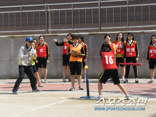 서울 동숭동의 서울사대부설여중의 학생들이 킥런볼 수업 중 1루로 달리고 있는 타자를 응원하기 위해 응원가를 부르고 있다. 하성룡 기자 jackiechan@sportschosun.com