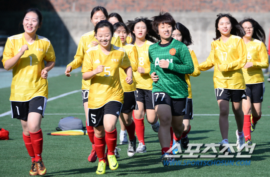 학교체육 '가락고-영파여고 축구 친선경기'가락고 학교 스포츠클럽 여자축구팀 학생들이 영파여고를 맞아 연습경기를 펼쳤다. 밝은 표정으로 훈련에 임하고 있는 여학생들. 송파=송정헌 기자 songs@sportschosun.com/2015.04.21